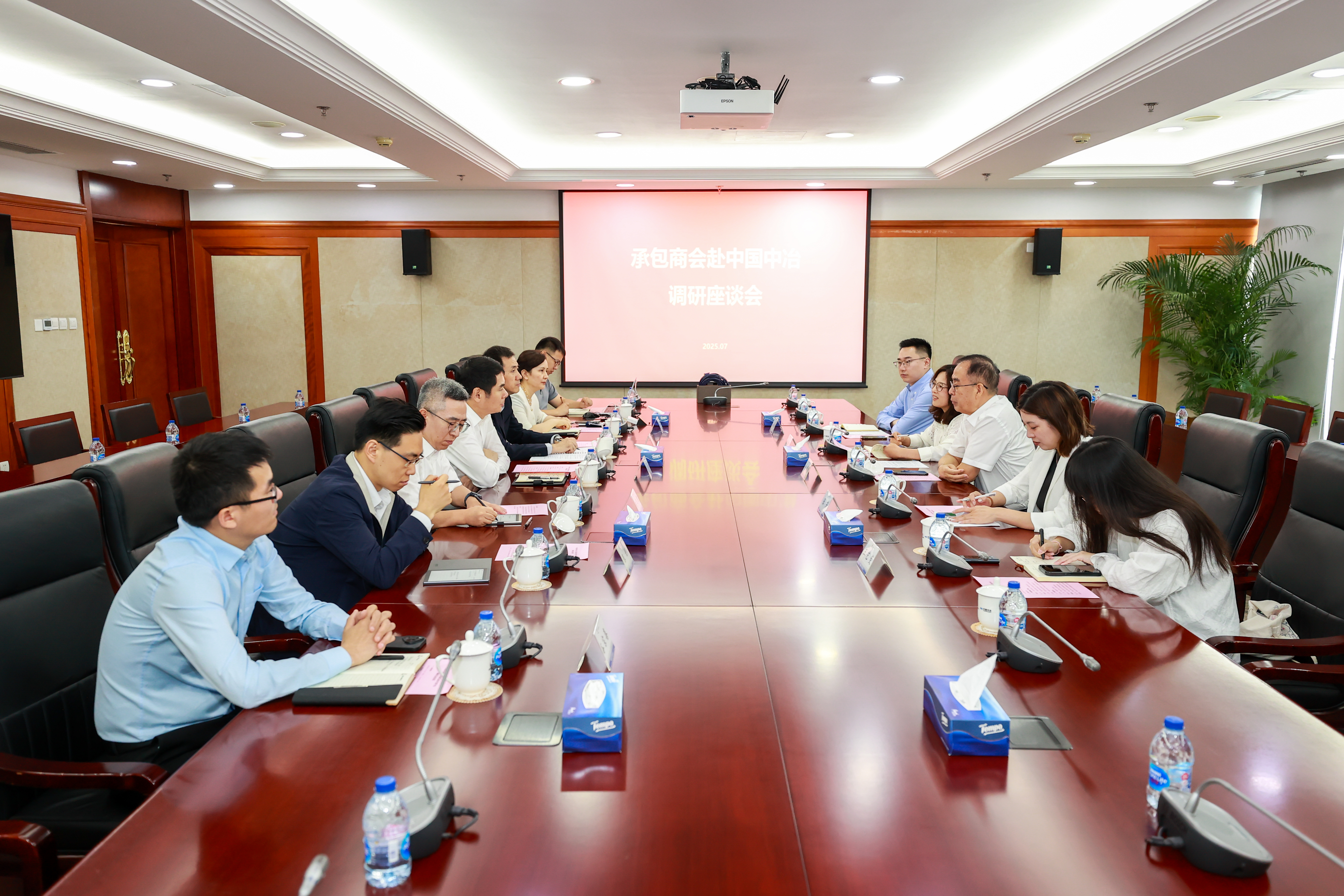 7月16日,中国中冶党委常委、副总裁朱广侠在中冶大厦会见中国对外承包工程商会辛修明副会长一行,就海外业务发展进行交流洽谈。